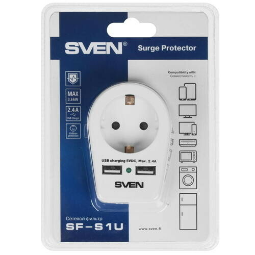 Фильтр SVEN SF-S1U (1 евро розетка, 2 USB) белый, блистер