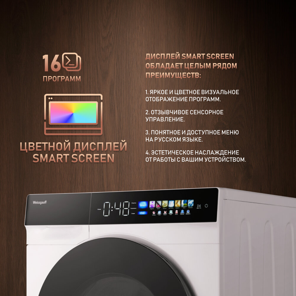 управление простое, есть СМАРТ режим, сама определит вес, количество воды и время. Белье отстирывает хорошо и бережно. Работает очень тихо, есть обработка паром. Отлично смотрится в колоне сушильной машиной с инвертором и ультрафиолетом Weissgauff WD 999 Heat Pump Full Touch