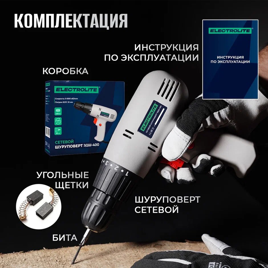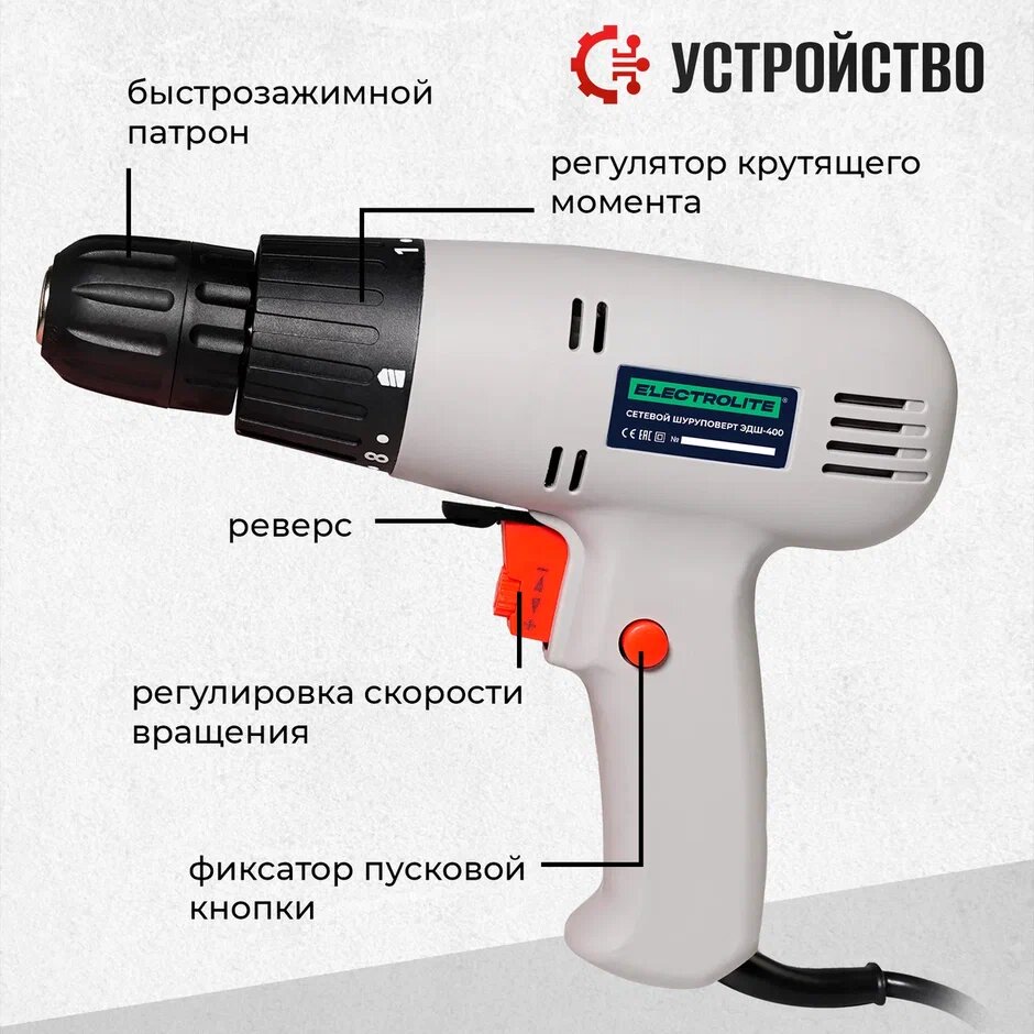 Шуруповерт электрический / Дрель электрическая безударная/ Дрель-шуповерт Electrolite ЭДШ-400 15 Н*м 800 об/мин интересное: