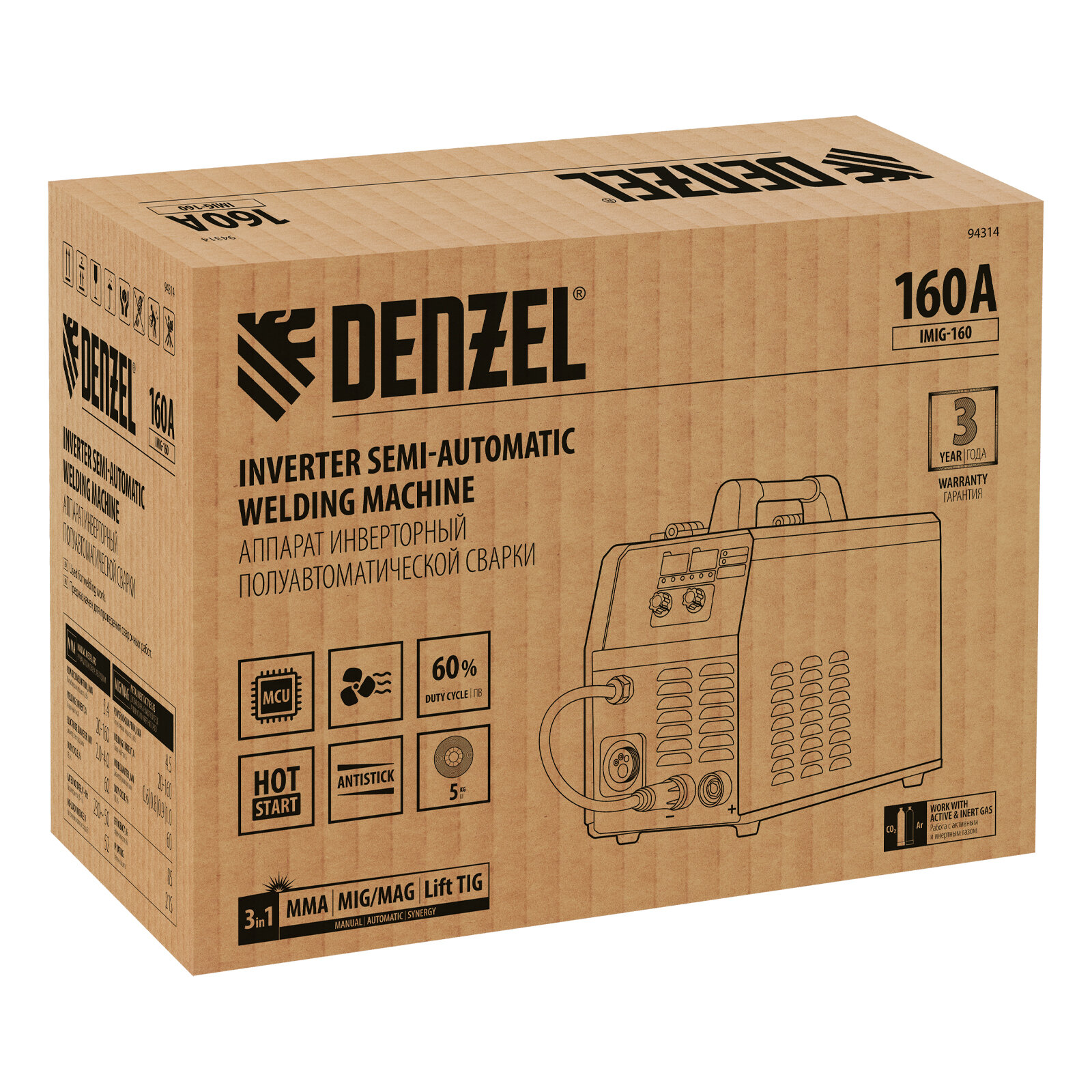 Сварочный аппарат инверторный, Denzel, IMIG-160 Sinergy, 142 А, электрод, полуавтоматическая сварка