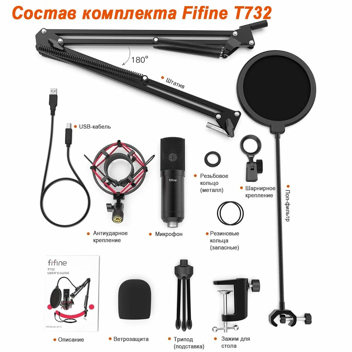 Конденсаторный USB-микрофон FIFINE T732 (Black) / стойка в комплекте / шокмаунт (паук) / ветрозащита / поп фильтр
