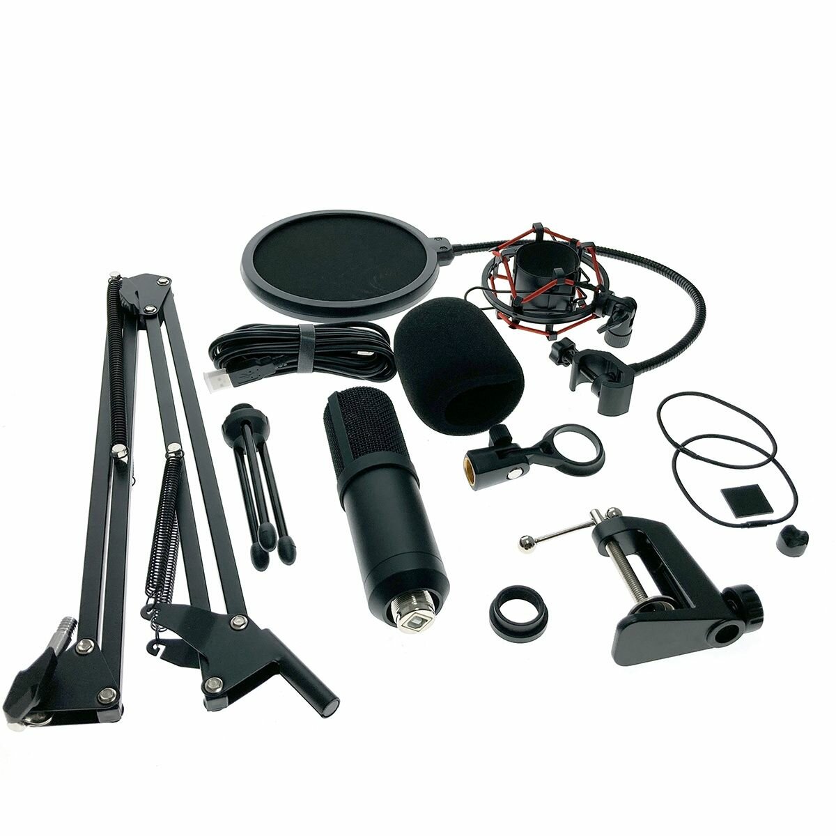 в комплект входит паук кронштейн и поп фильтр есть ещё обычный фильтр звук хороший без настройки поиграть во дискорду или записать видео с ним можно спокойно |