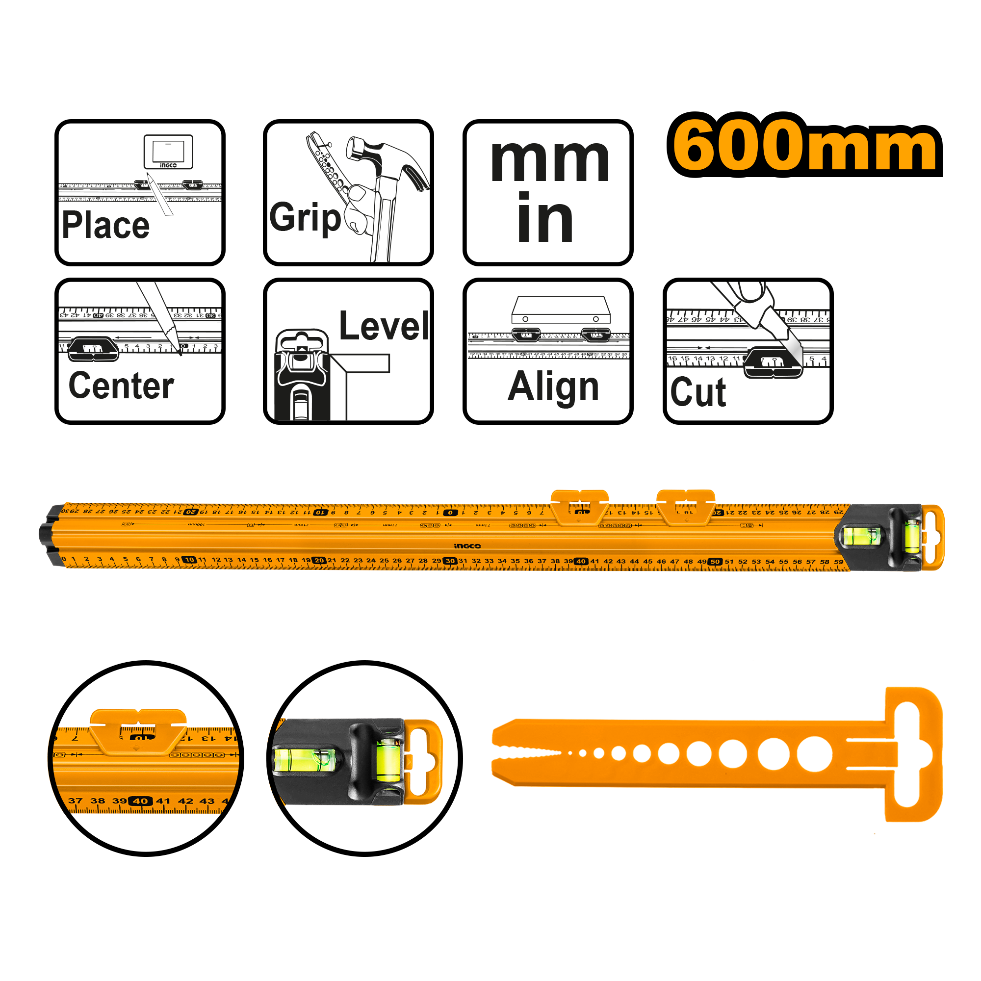 Линейка многофункциональная с уровнем INGCO 600 мм
