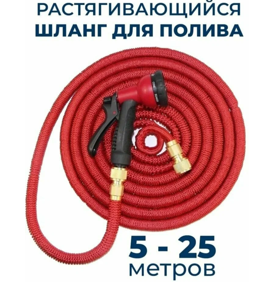 Шланг садовый растягивающийся 25 метров для полива с распылителем с быстросъемом/ 25 метров красный с металлическим соединением, быстросъём
