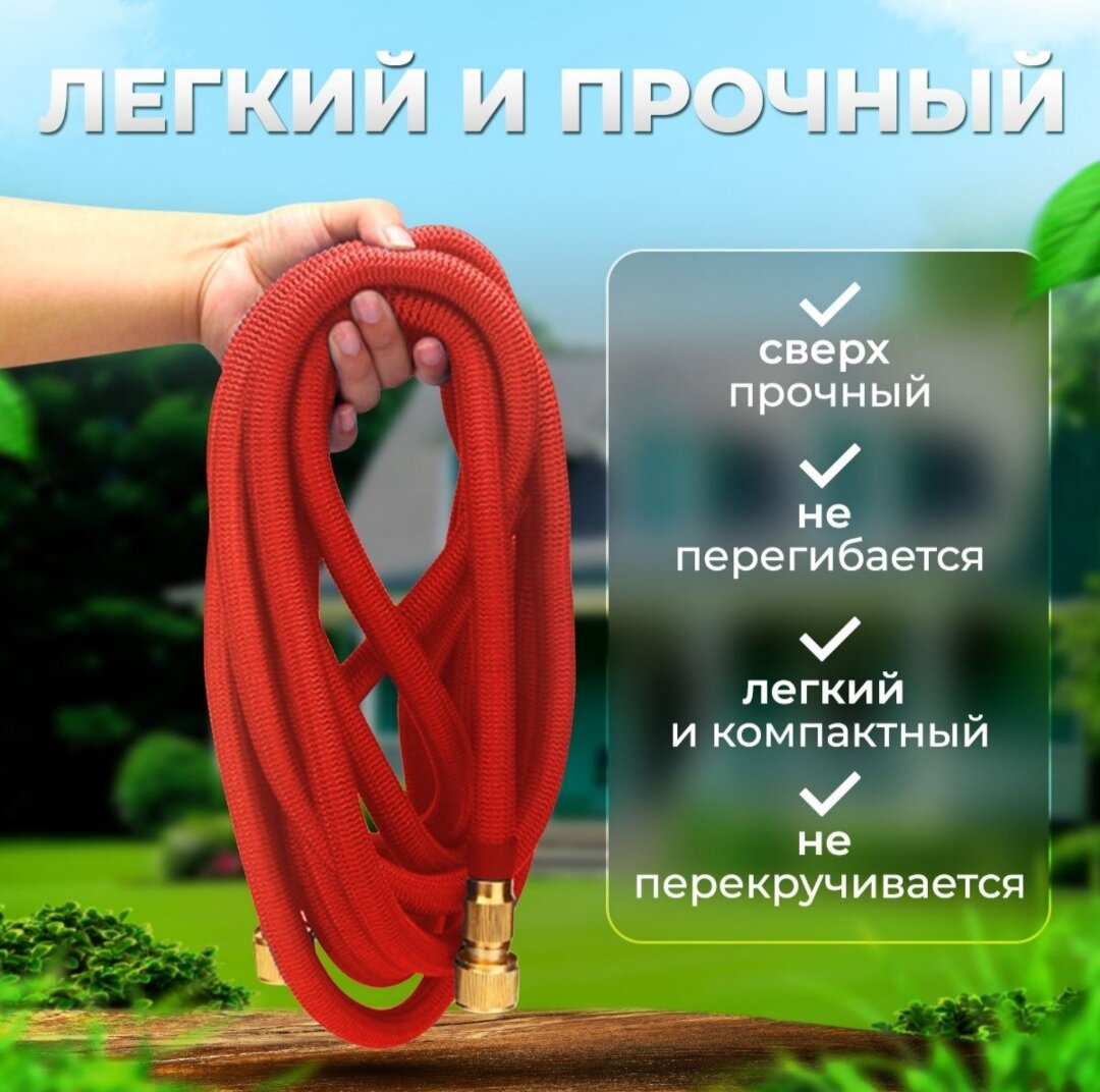 Шланг садовый растягивающийся 50 метров, с распылителем 7 режимов, PREMIUM качество, с металлическим соединением 3/4, для полива, красный, шланг дачный
