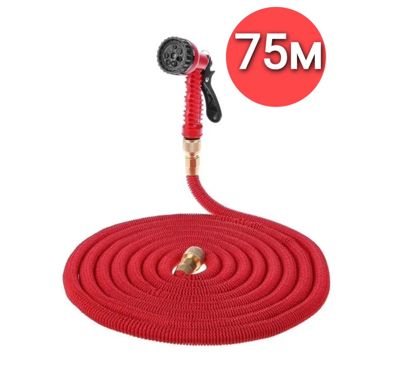 Шланг садовый растягивающийся 75 метров для полива с распылителем с быстросъемом/ 75 метров красный с металлическим соединением, быстросъём