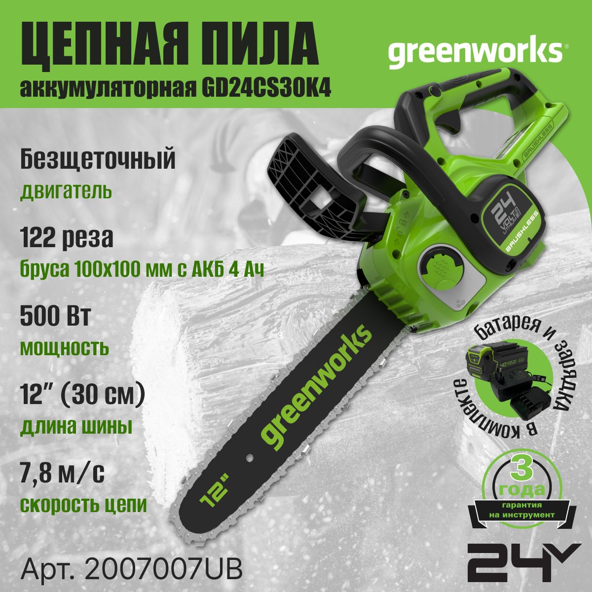Пила аккумуляторная Greenworks (24V, GD24CS30, 30 см, в комплекте с АКБ 4 А·ч и ЗУ (2007007UB))