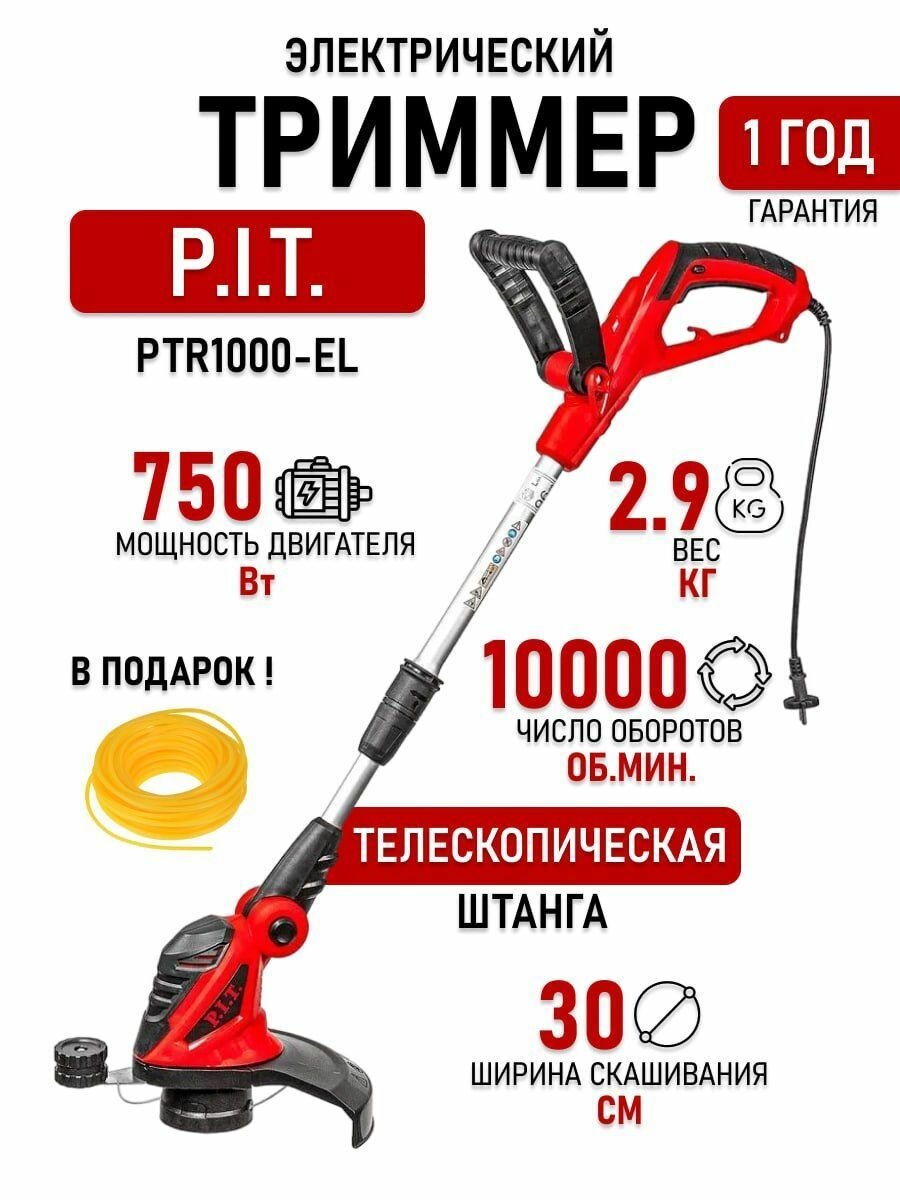 Электротриммер PTR1000-EL (750Вт, телескоп. штанга, ширина скоса 300мм, 10000об/мин) P.I.T