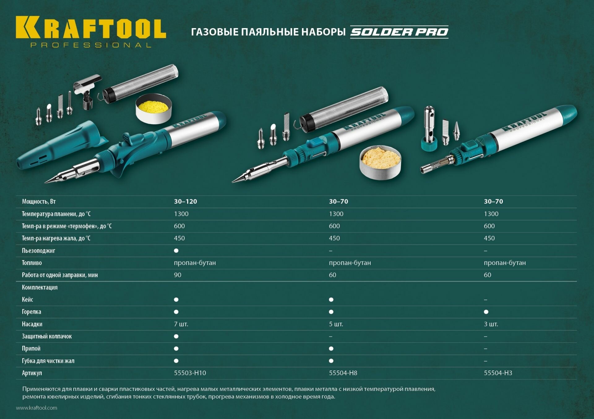 Газовый паяльник KRAFTOOL SolderPro 120K 55503-H10, 30-120 Вт, горелка, фен, пьезоподжиг, 1300С