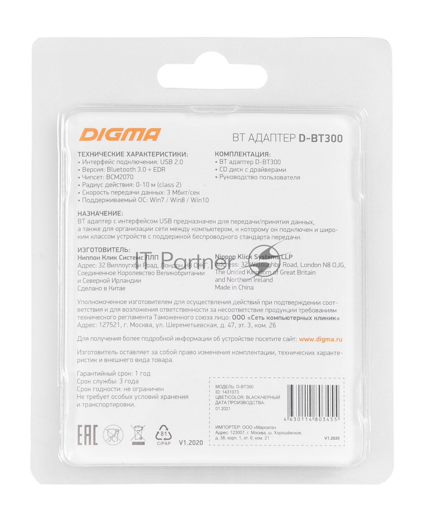 Bluetooth адаптер Digma D-BT300