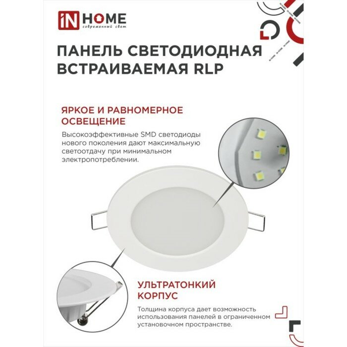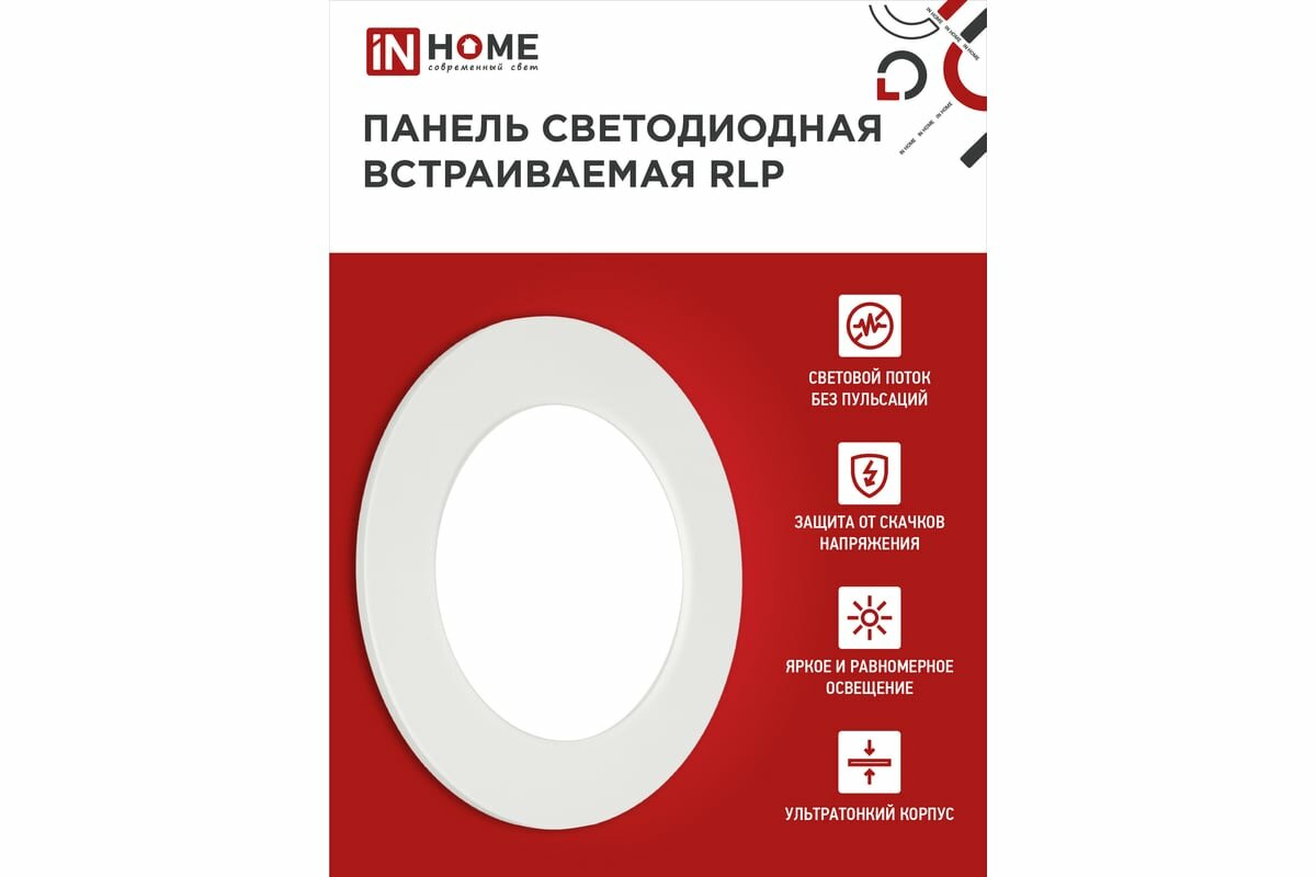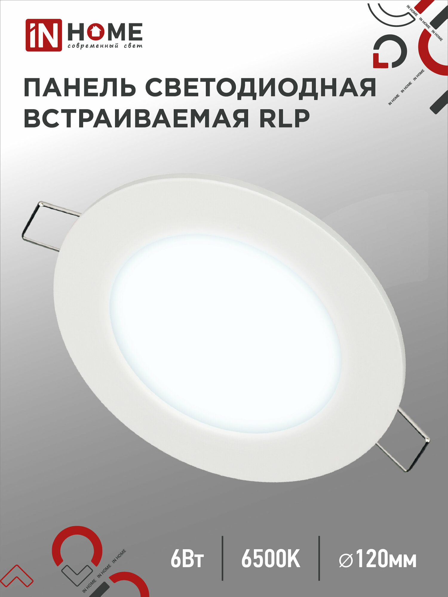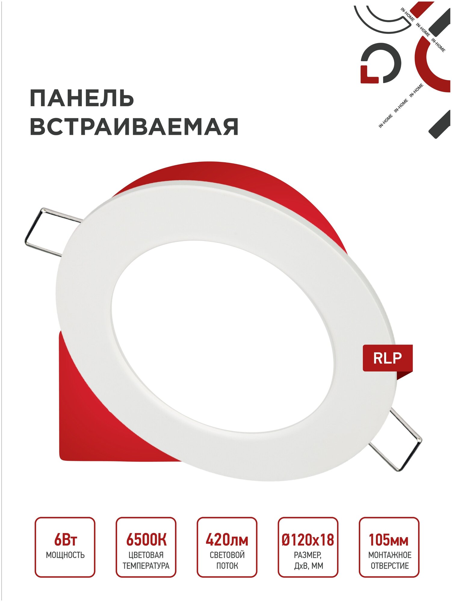 IN HOME Панель сд встраиваемая круглая RLP 6Вт 230В 6500К 420Лм 120мм белая IP40 (арт. 4690612038452)