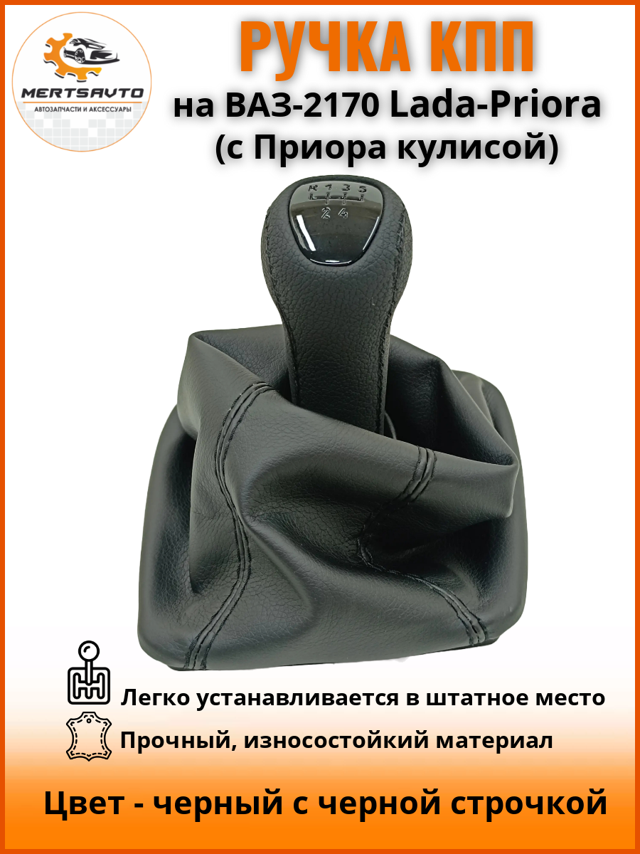 Ручка КПП с чехлом "люкс-черный" на ВАЗ-2170 Лада Приора 1 (Lada Priora 1) с Приора кулисой, ручка коробки переключения передач, черный с белой строчкой