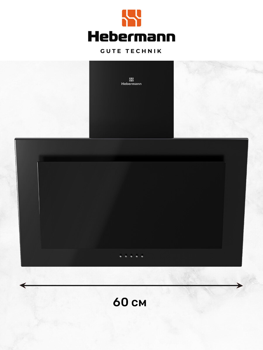 Наклонная кухонная вытяжка Hebermann HBKH 60.5 B, 60 см, черная, кнопочное управление, LED лампы, отделка- окрашенная сталь, стекло, производительность 700 м³/ч