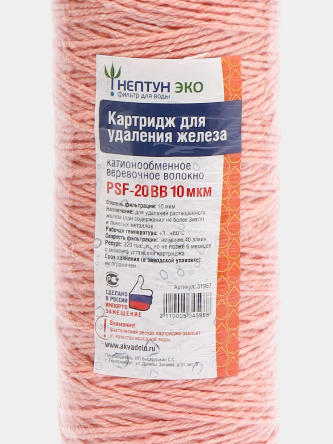 Картридж фильтра для очистки воды нитяной от железа “Нептун” PSF-20BB 10мкм. Катионообменная красная нить. Обезжелезивание