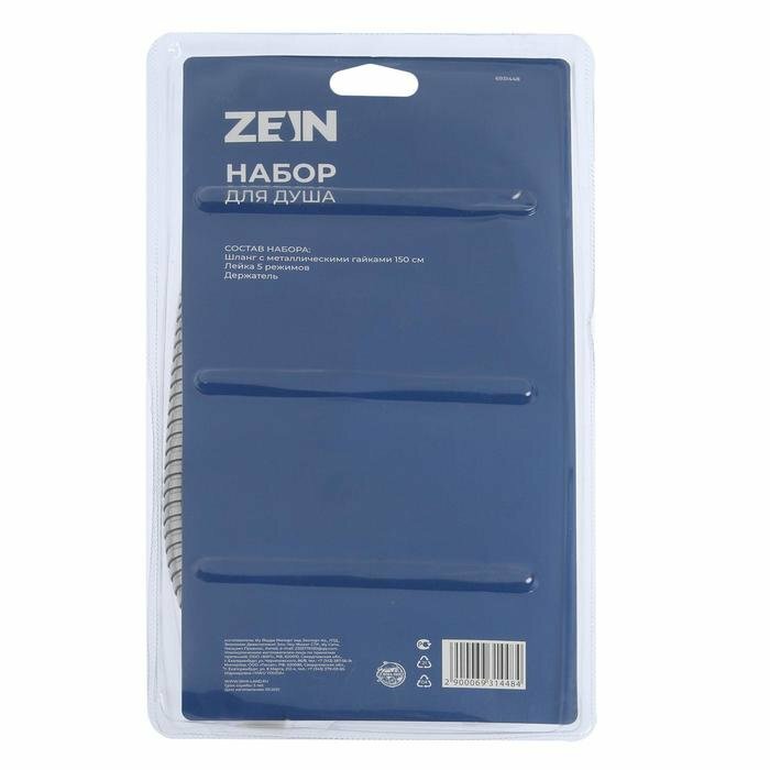 Набор для душа ZEIN Z0405, шланг 150 см, держатель, лейка 5 режимов, черн.ручка, хром