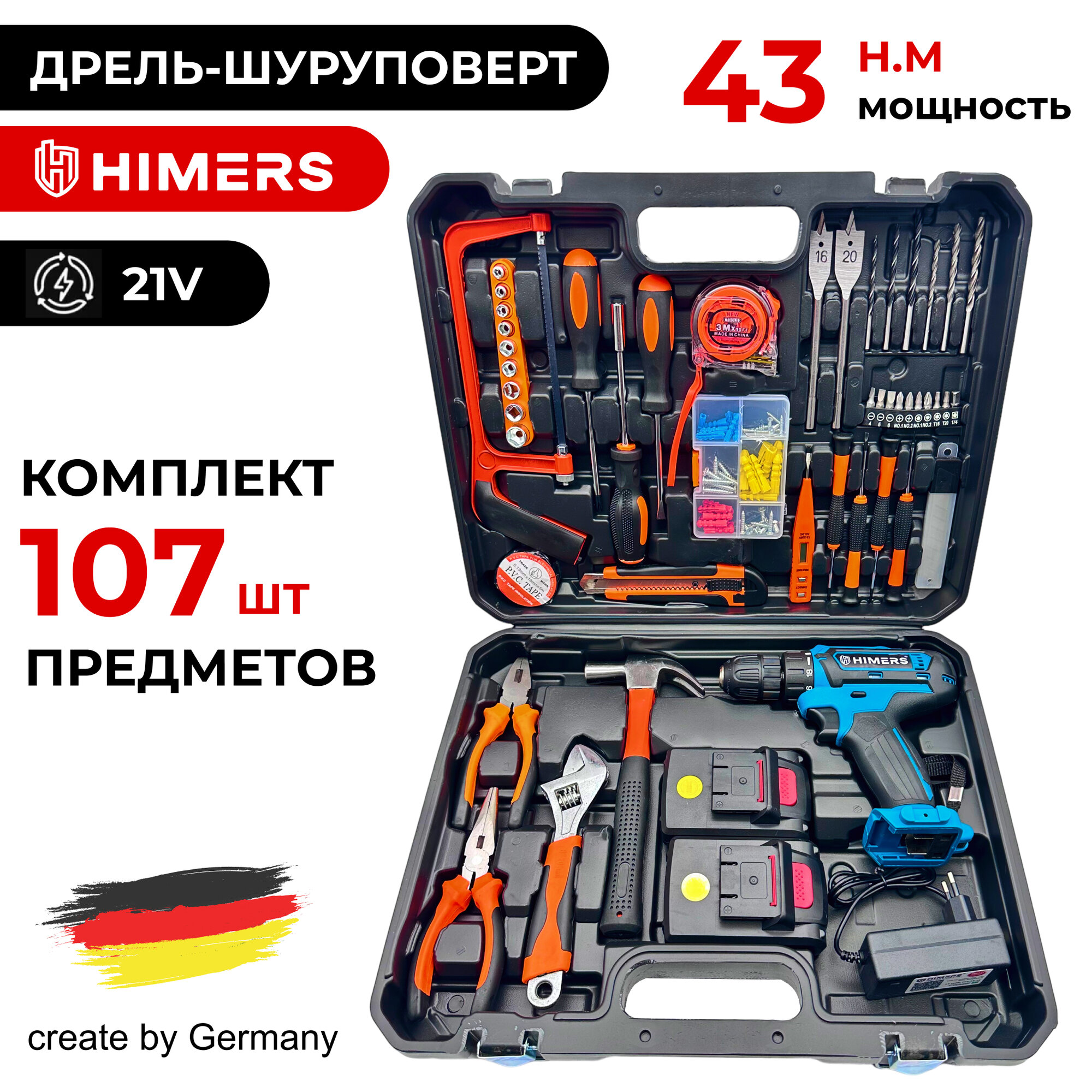 Дрель - шуруповерт HIMERS DF48B аккумуляторный 21V, 2 АКБ, 43 Н.м, 10мм патрон / Кейс с набором бит, свёрел, головок инструментов 107 предметов / многофункциональный для сверления, долбления, закручивания 21В