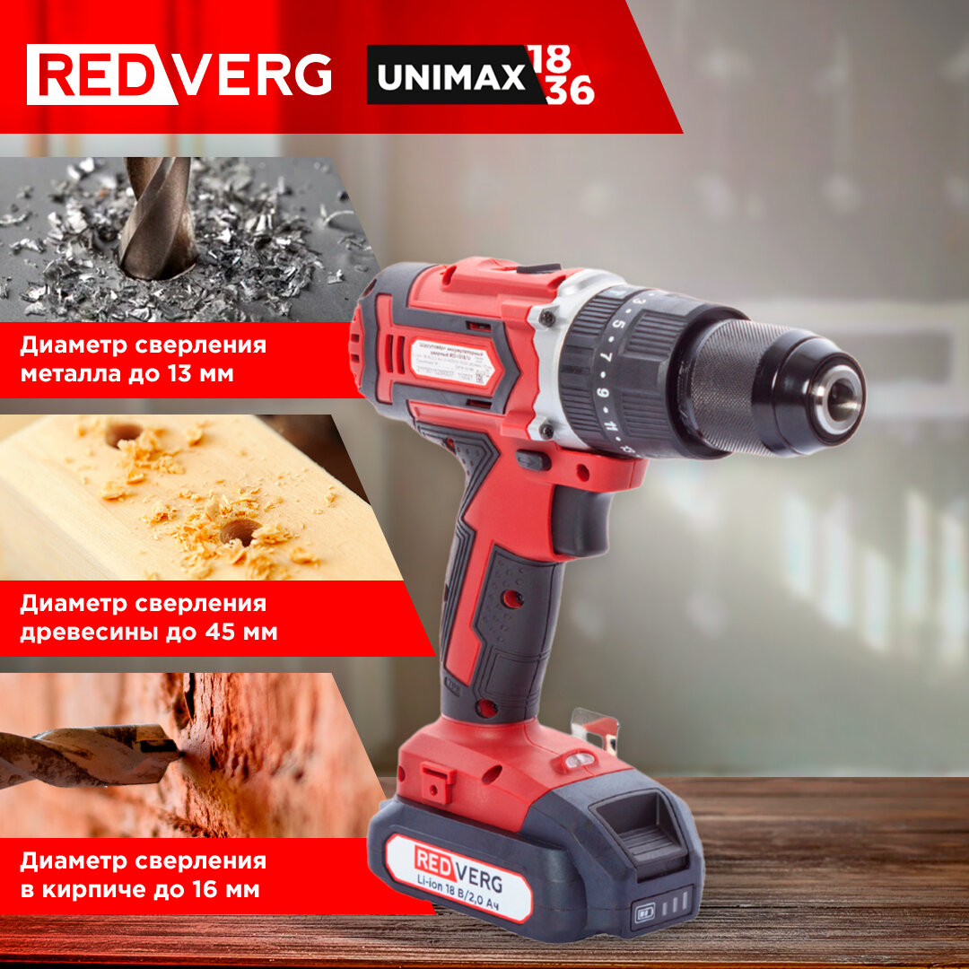 Дрель RedVerg RD-S18/U аккумуляторная (18В,Li-ion,2х2Ач,0-400/1500об/мин,45Нм,БЗП 1.5-13мм) 3.6кг кейс интересное: