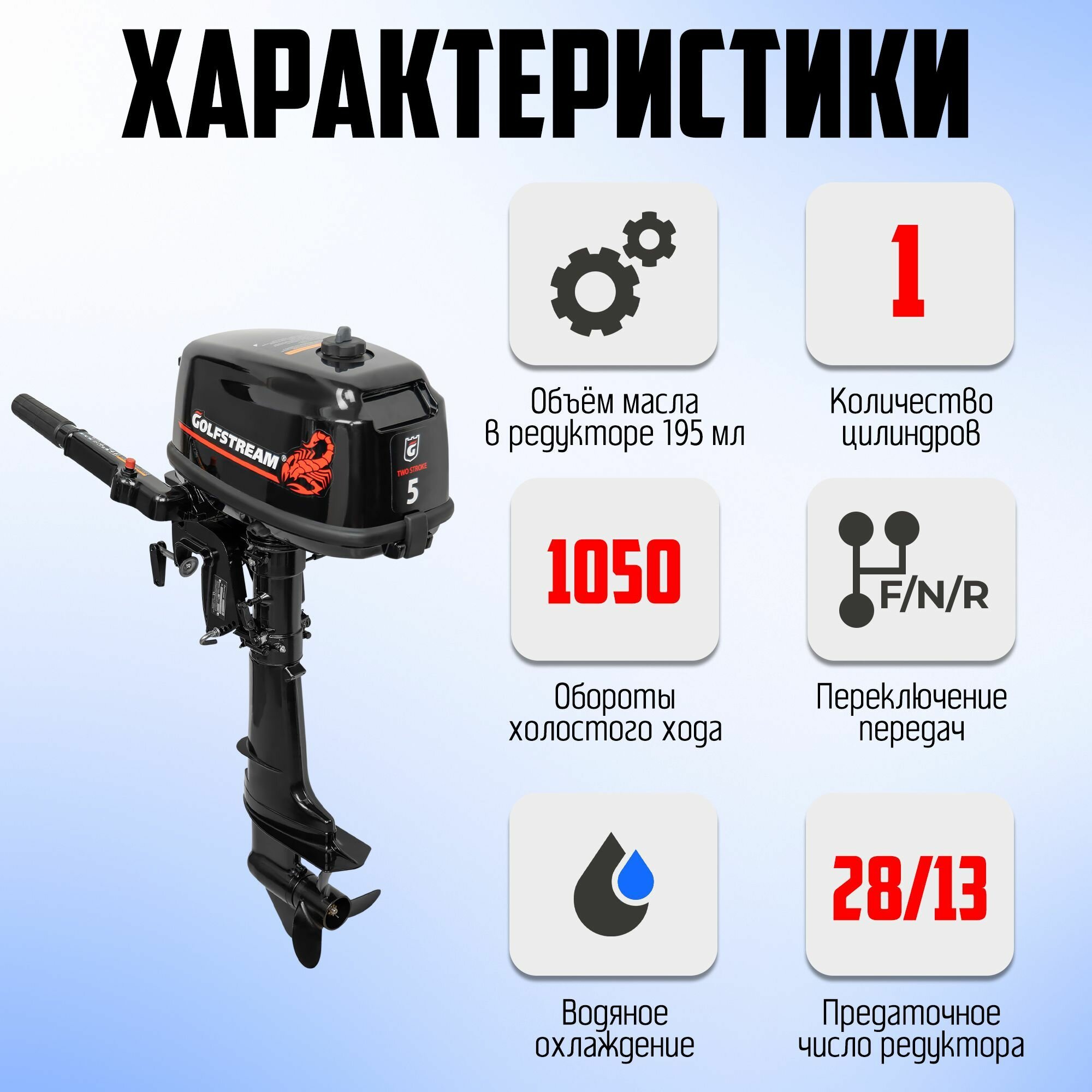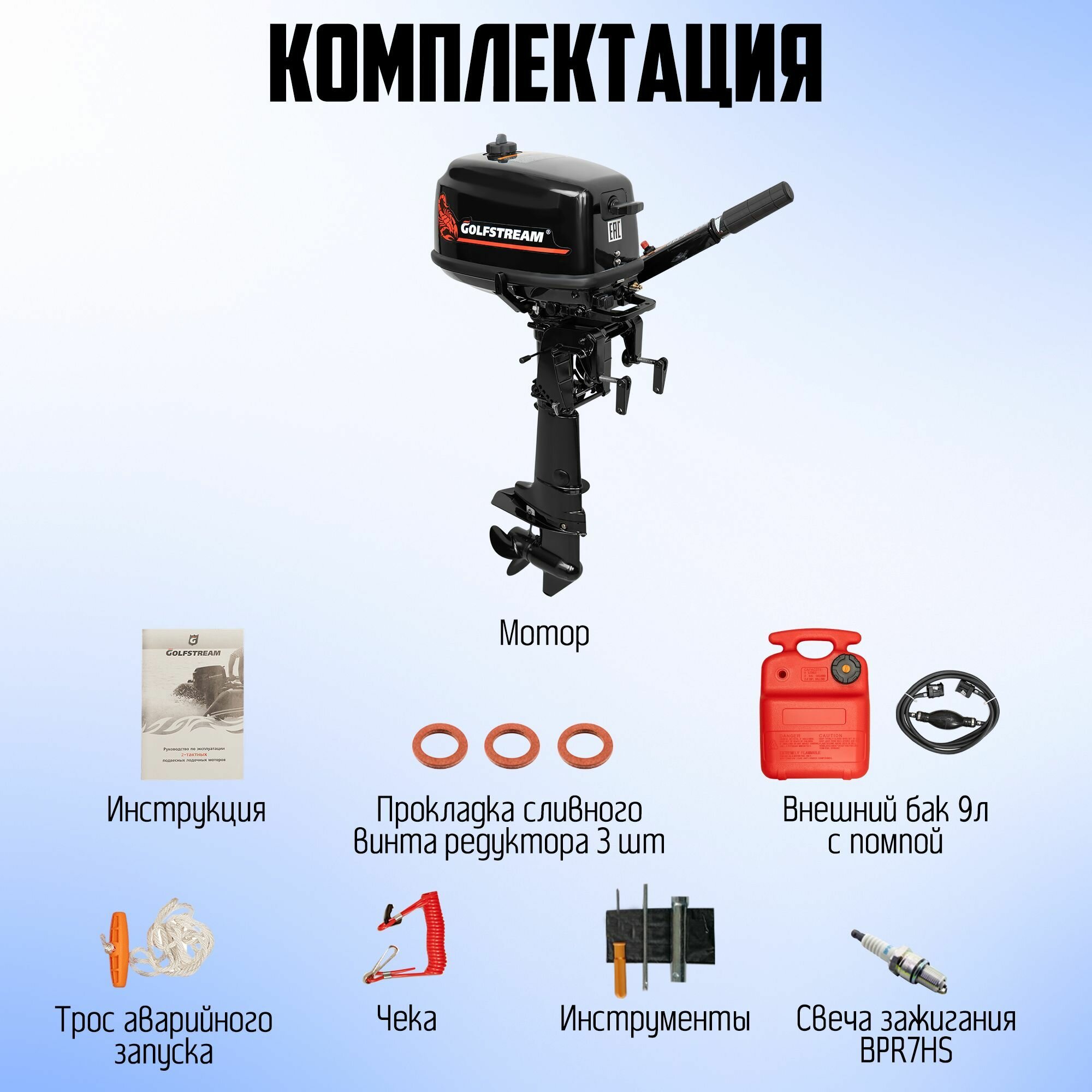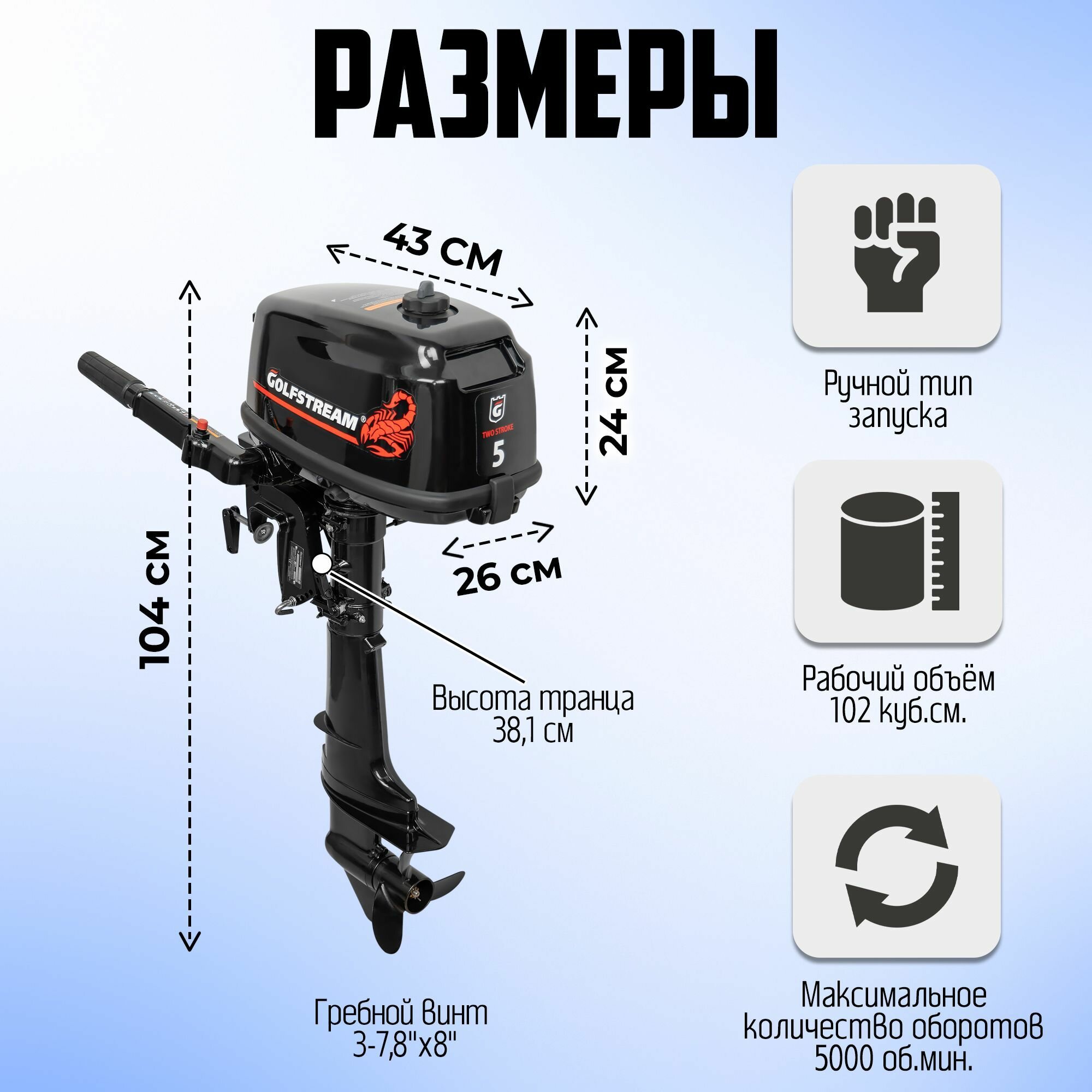 Лодочный мотор GOLFSTREAM T 5 NBMS, 5 л.с., 102 см3, бензиновый, 2 тактный (PARSUN) внешний бак в подарок интересное: