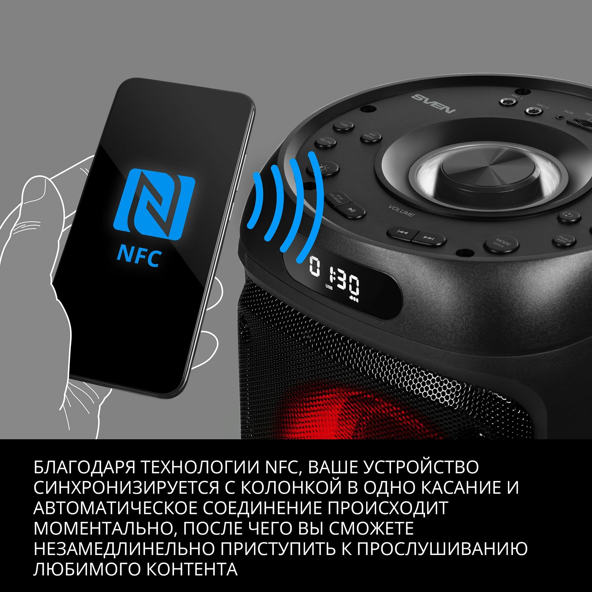 Купить Мобильные колонки SVEN PS-770 2.0 чёрные (2x50W, mini Jack, USB, Bluetooth, FM, micro SD, NFC, LED-дисплей, ПДУ, 4400 мA, LED подсветка)