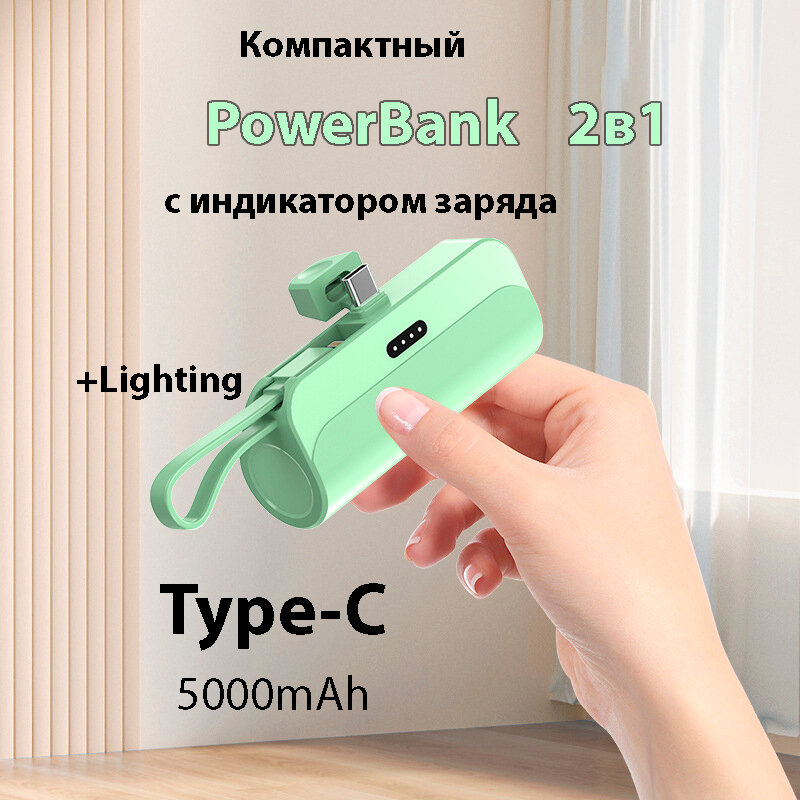 СохранитьВнешний аккумулятор 2в1 5000 mAh основной Type-C и шнур lighting , Powerbank MINI (Зеленый) интересное: