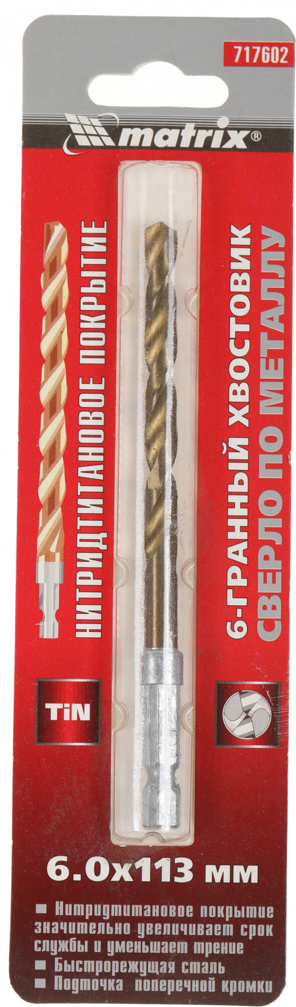 Сверло по металлу MATRIX 717602, 6 мм, HSS, нитридтитановое покрытие, 6-гранный хвостовик