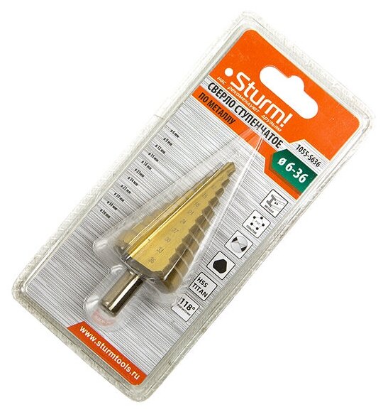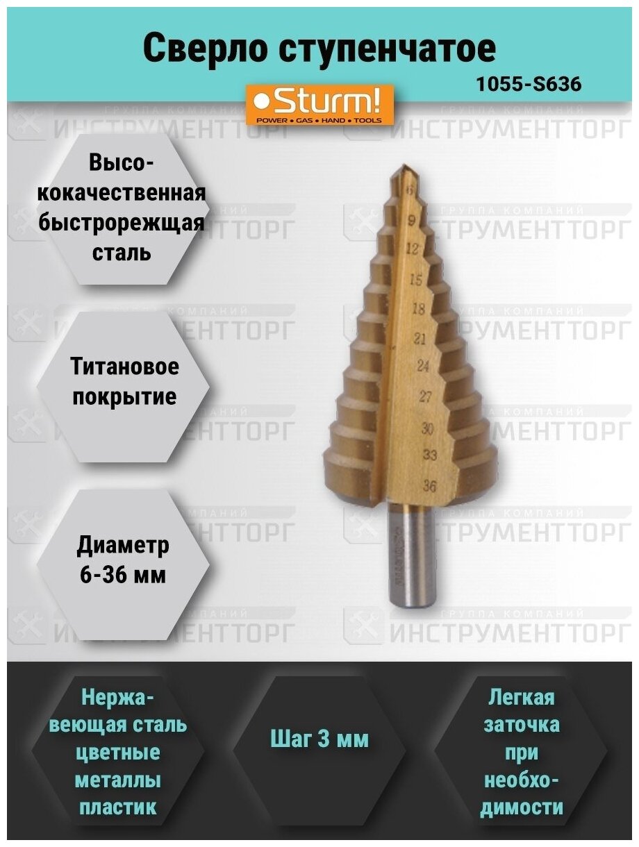 Сверло ступенчатое по металлу STURM 1055-S636 (6-36мм, шаг 3мм, HSS+TIN)