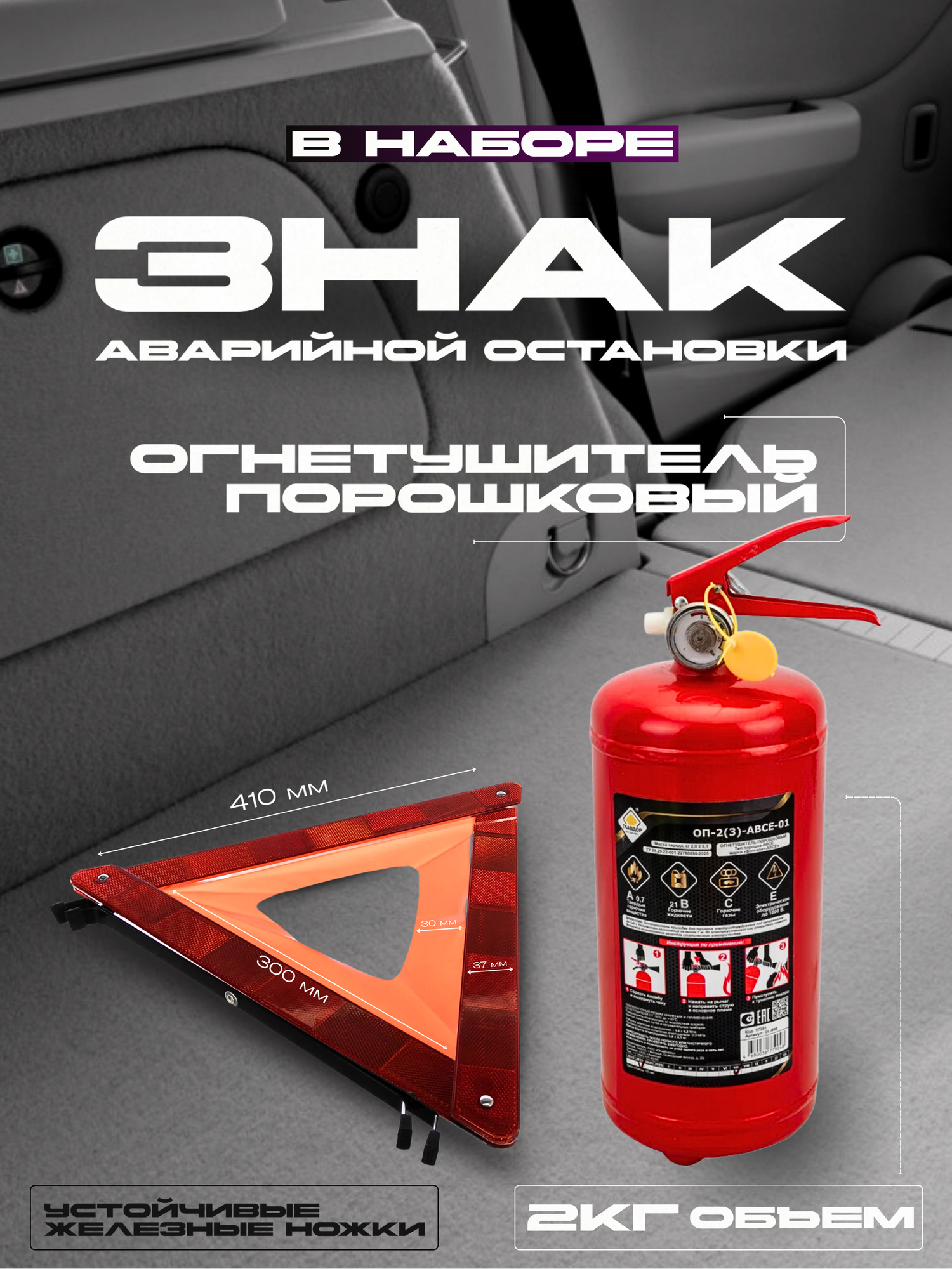 | В наборе | аптечка / жилет светоотражающий / знак аварийной остановки / огнетушитель / перчатки / пусковые провода / трос буксировочный / 7 / 7 / маска / сумка |