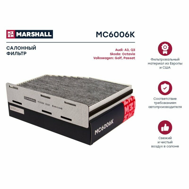 Фильтр салонный угольный Skoda Octavia II (1Z) 04-, VW Golf V, VI 03-, VW Passat (36, 3C) 05- (MC600 MARSHALL MC6006K | цена за 1 шт