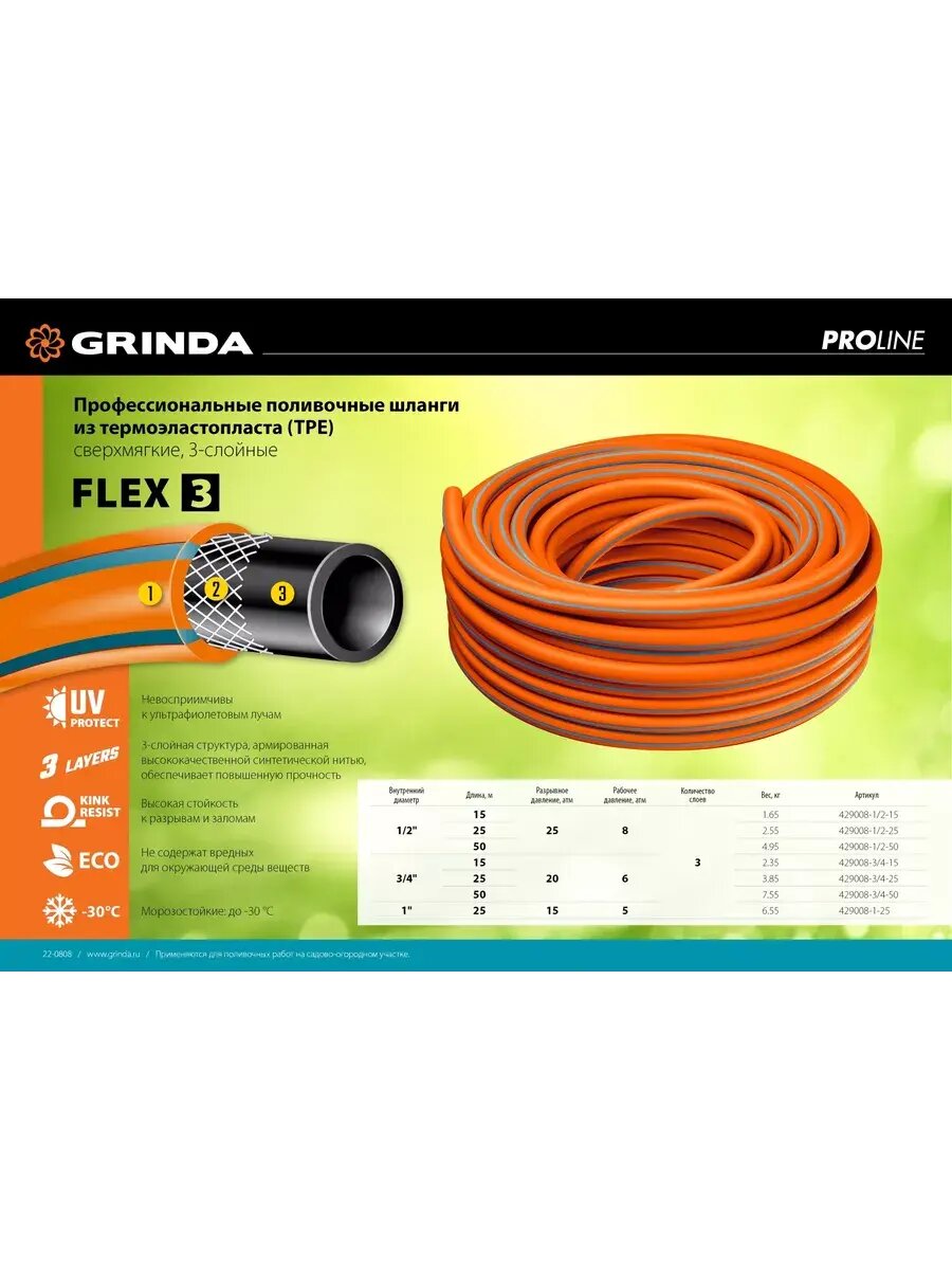 GRINDA FLEX 3, 1/2″, 25 м, 25 атм, из термоэластопласта, трёхслойный, армированный, гибкий, поливочный шланг, PROLine (429008-1/2-25)