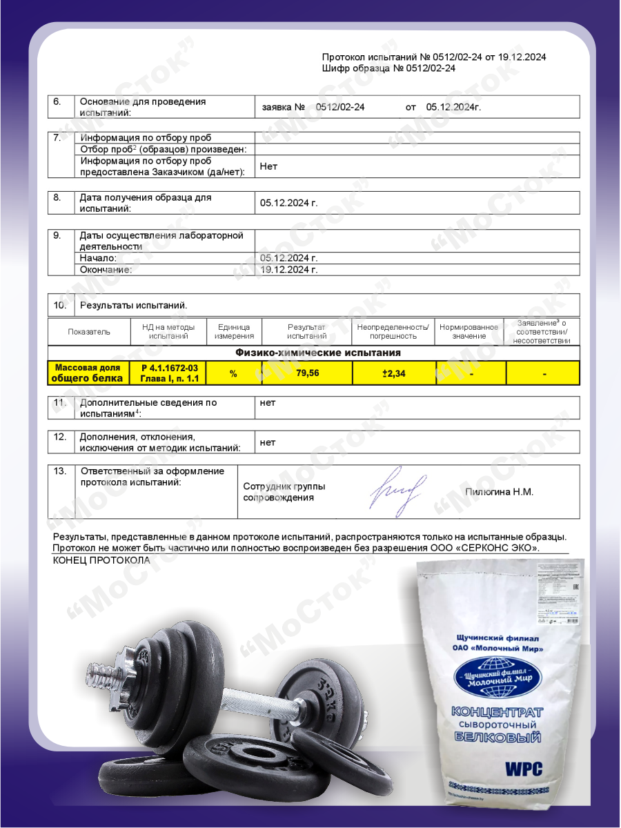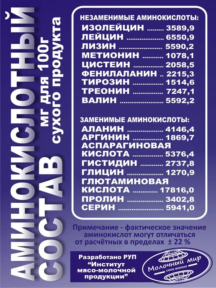 | Дополнительная информация | Состав: сыворотка молочная подсырная. Аминокислотный состав, мг. для 100г сухого продукта. Незаменимые аминокислоты: Изолейцин 6818,22/Лейцин 6320,94/Лизин 8872,05/Метионин 688,64/Цистеин 1393,90/Фенилаланин 2586,50/Тирозин 2451,25/Треонин 4488,28/Валин 3911,90 Заменимые аминокислоты: Аланин 4363,48/Аргинин 3968,68/Аспаргиновая кислота 7218,66/Гистидин 2997,45 Глицин 2125,24/Глютаминовая кислота 13521,14/Пролин 4732,62/Серин 3367,14 Примечание - Фактическое значение аминокислот могут отличаться от расчётных в пределах ±22% Энергетическая ценность (калорийность), кДж/ккал: 1600/380 Пищевая ценность 100г продукта: белки 80г, жиры 5,5г, углеводы 2,0г. |