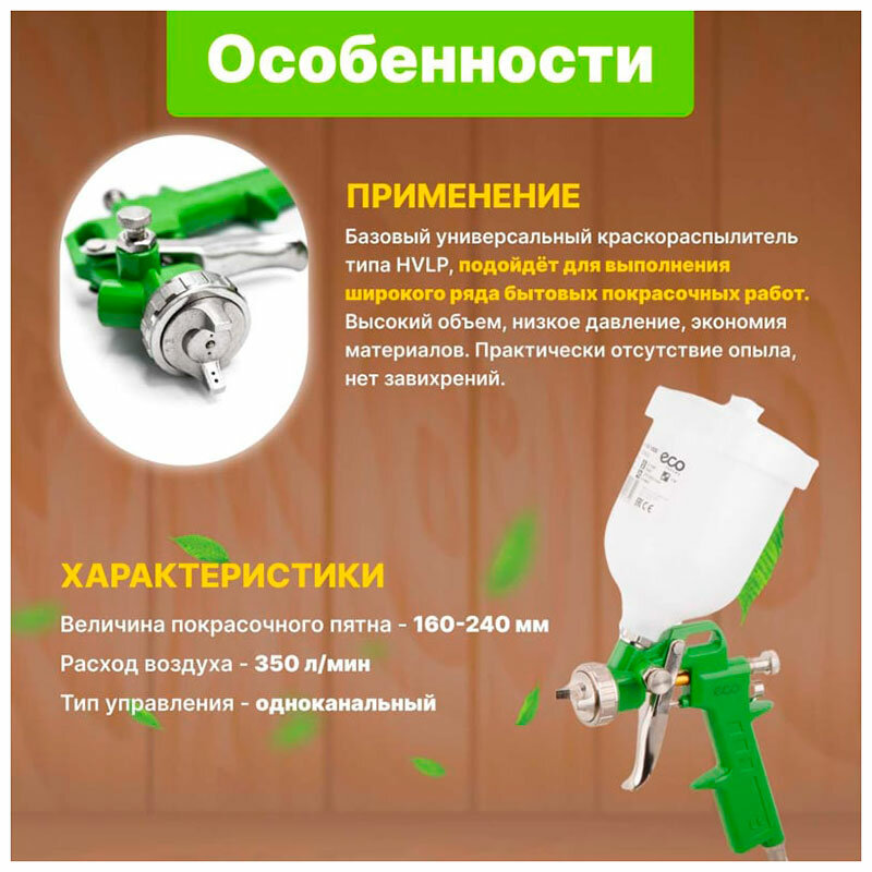 Краскораспылитель ECO SG-1000H25U (объем бачка 0.6 л, расход воздуха 350 л/мин) интересное: