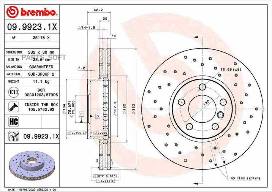 Диск тормозной для автомобиля BMW, BREMBO 09.9923.11 (1 шт.)