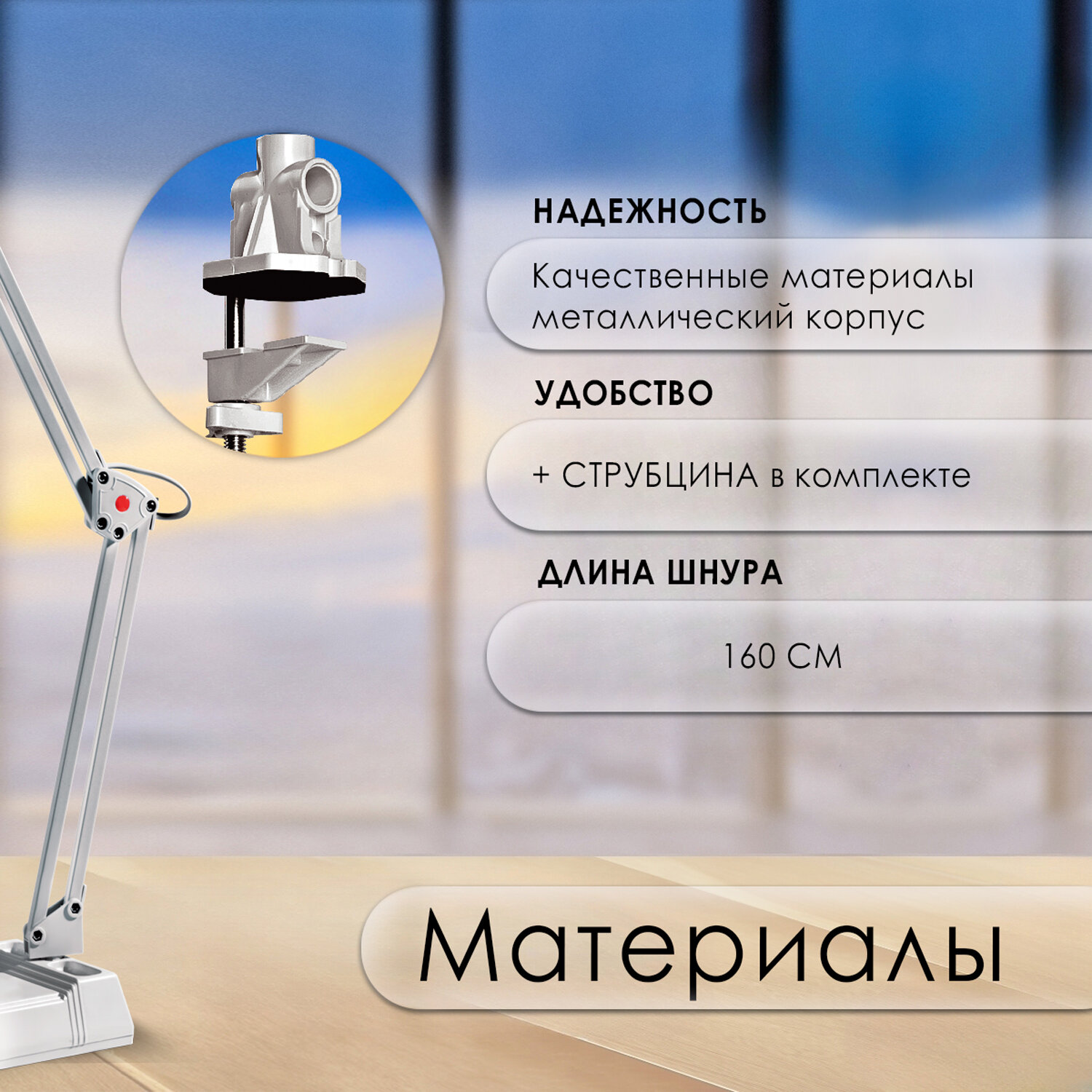 | Минусы: | Струбцина и штифт основания лампы в который в неё вставляются сделаны из хлипкого пластика и отламывается при любой попытке изменить положение лампы.