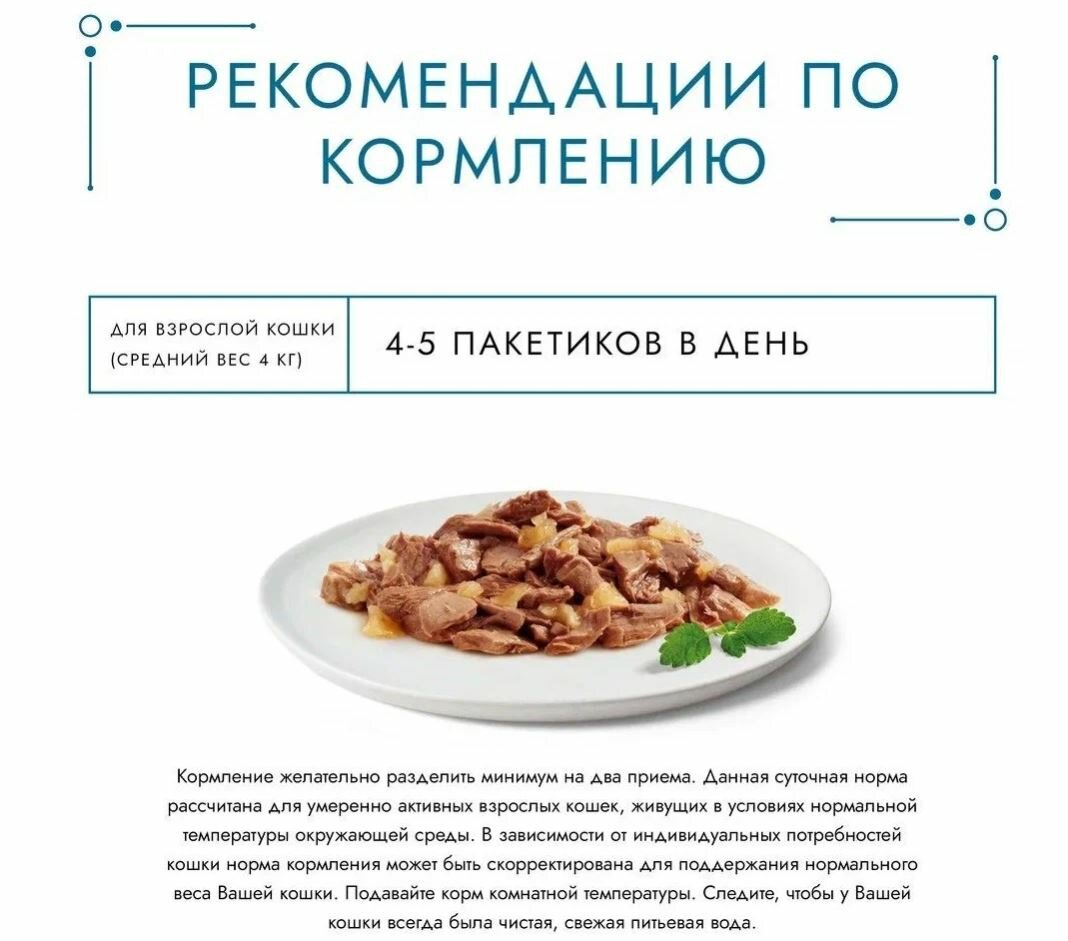 | Дозировка | для взрослой кошки среднего веса (4 кг) требуется 4-5 пакетиков в день, кормление желательно разделить минимум на 2-3 приема |