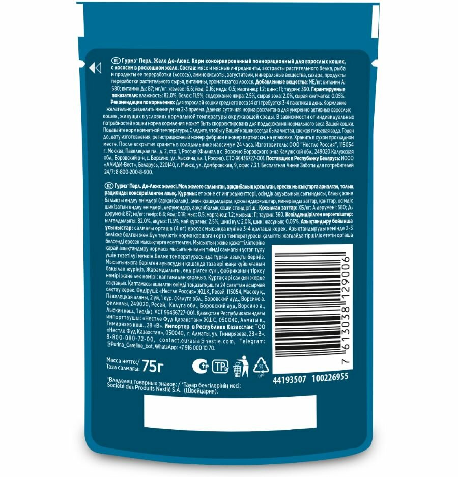 Корм влажный для взрослых кошек гурмэ Желе Де-Люкс с лососем, 75г