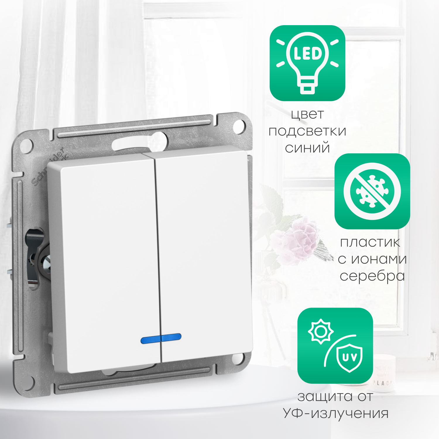 Выключатель 2-клавишный ATLASDESIGN, с подсветкой, скрытый монтаж, жемчуг | код. ATN000453 | Schneider Electric (7шт. в упак.)
