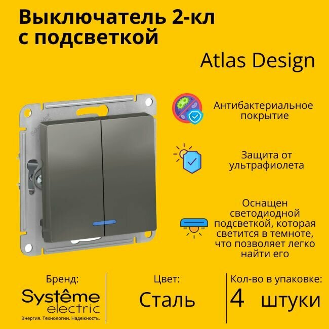 Купить Выключатель электрический Schneider Electric (Systeme Electric) Atlas Design 2-клавишный с подсветкой, 10А, 10 AX,Сталь ATN000953 - 4 шт.