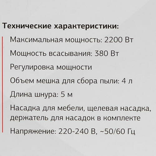 | В комплекте | насадка для мягкой мебели, универсальная насадка для сухой уборки, щелевая насадка, насадка для мягкой мебели, универсальная насадка для сухой уборки, щелевая насадка, насадка для пола и ковров, щёточка для чистки обивки мягкой мебели |