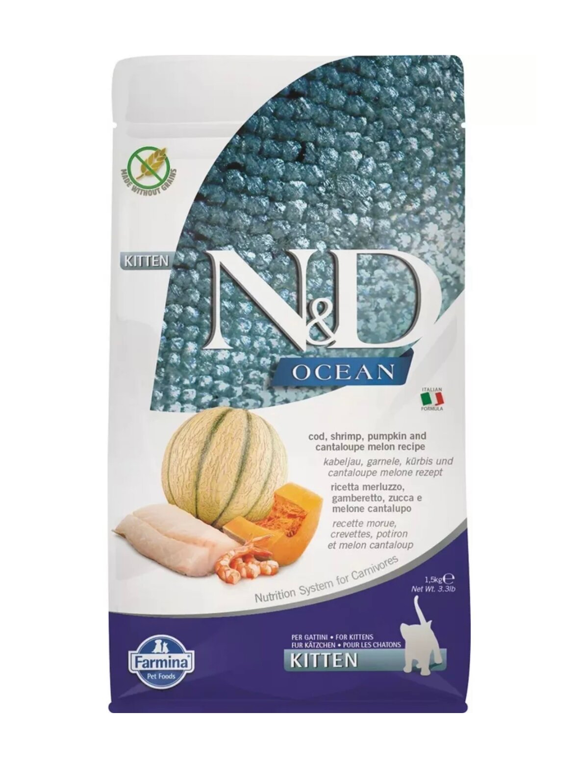 FARMINA CAT N&D OCEAN KITTEN COD, SHRIMP, PUMPKIN & CANTALOUPE MELON беззерновой для котят, беременных и кормящих кошек с треской, креветками, тыквой и дыней (1,5 кг)