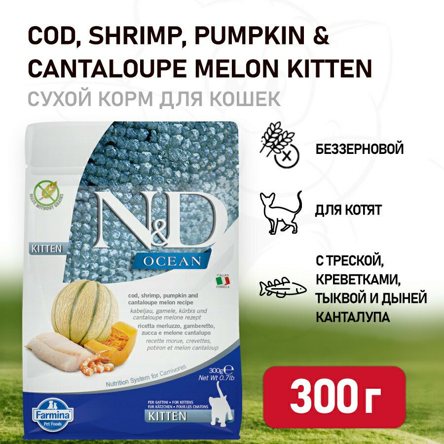 FARMINA CAT N&D OCEAN KITTEN COD, SHRIMP, PUMPKIN & CANTALOUPE MELON беззерновой для котят, беременных и кормящих кошек с треской, креветками, тыквой и дыней (0,3 кг)
