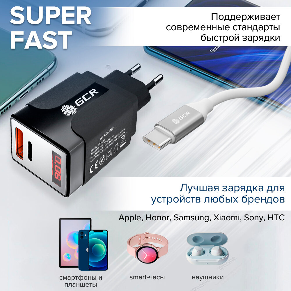 GCR Сетевое зарядное устройство на 2 USB порта (QC 3.0 + PD 3.0 ), черный
