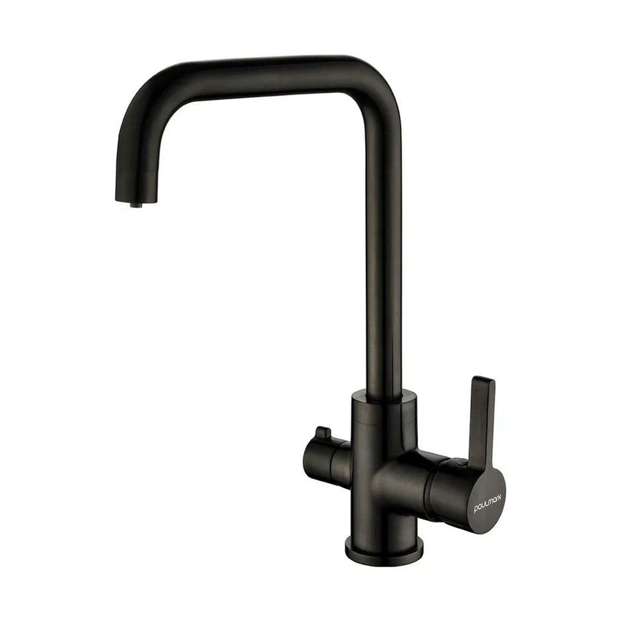 Смеситель кухонный с подключением фильтра питьевой воды Paulmark LOGAS, высокий поворотный излив, двурычажный, латунь, на мойку / столешницу, черный, Lo213021-308
