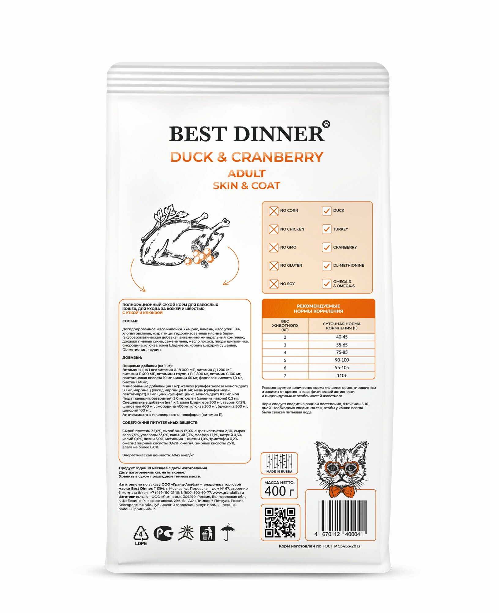 Сухой корм для кошек Best Dinner для здоровья кожи и блеска шерсти, утка, с клюквой 400 г