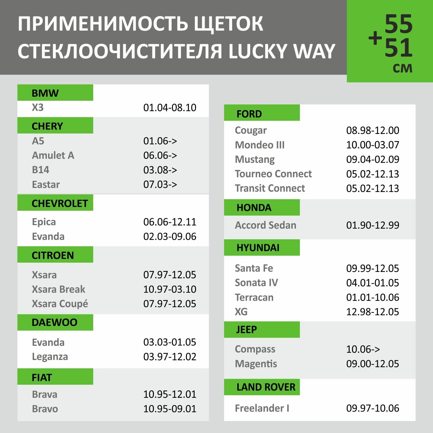2 Щетки стеклоочистителя в комплекте (55+51 см), Дворники для автомобиля LuckyWay для MITSUBISHI Pajero 06-Н. В; FORD Mondeo III 00-07; HYUNDAI Santa Fe 99-05; BMW X3 04-10