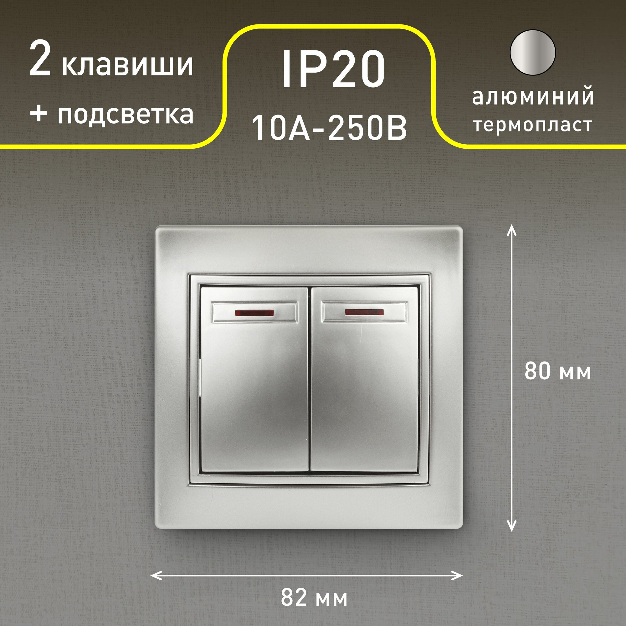 Купить Выключатель Intro Plano 1-105-03 двухклавишный с подсветкой 10А-250В IP20 СУ алюминий