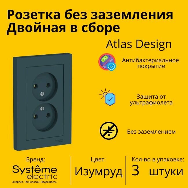 Купить Розетка электрическая двухместная Schneider Electric (Systeme Electric) Atlas Design без заземления в сборе 16А, Изумруд ATN000820 - 3 шт.