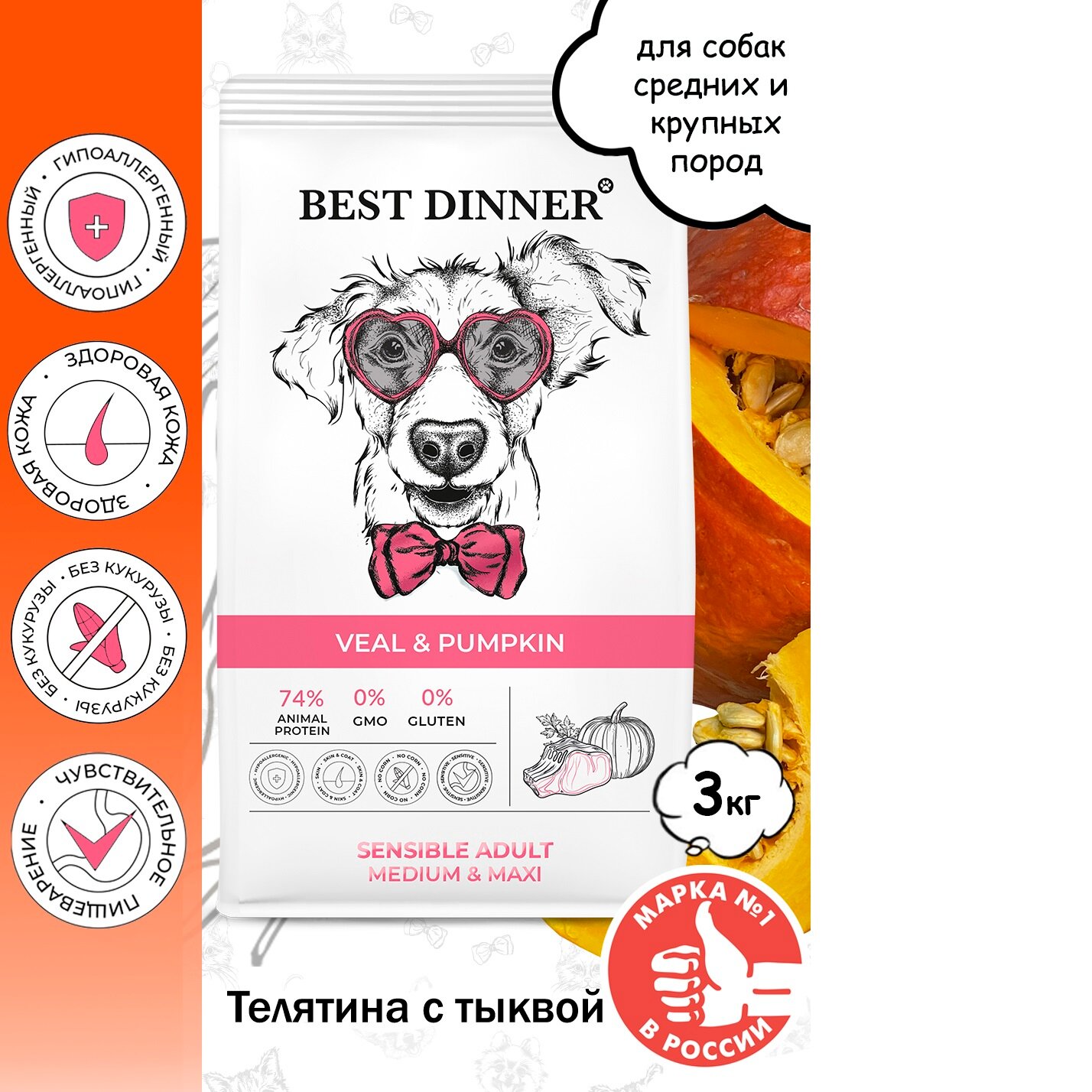 Купить BEST DINNER DOG ADULT MEDIUM & MAXI SENSIBLE для взрослых собак средних и крупных пород с чувствительным пищеварением с телятиной и тыквой (3 кг)