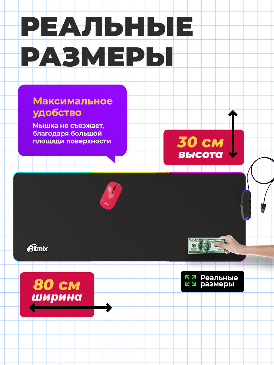 Коврик для мышек Ritmix с подсветкой и USB хабом 800 x 300 x 3 мм MPD-480