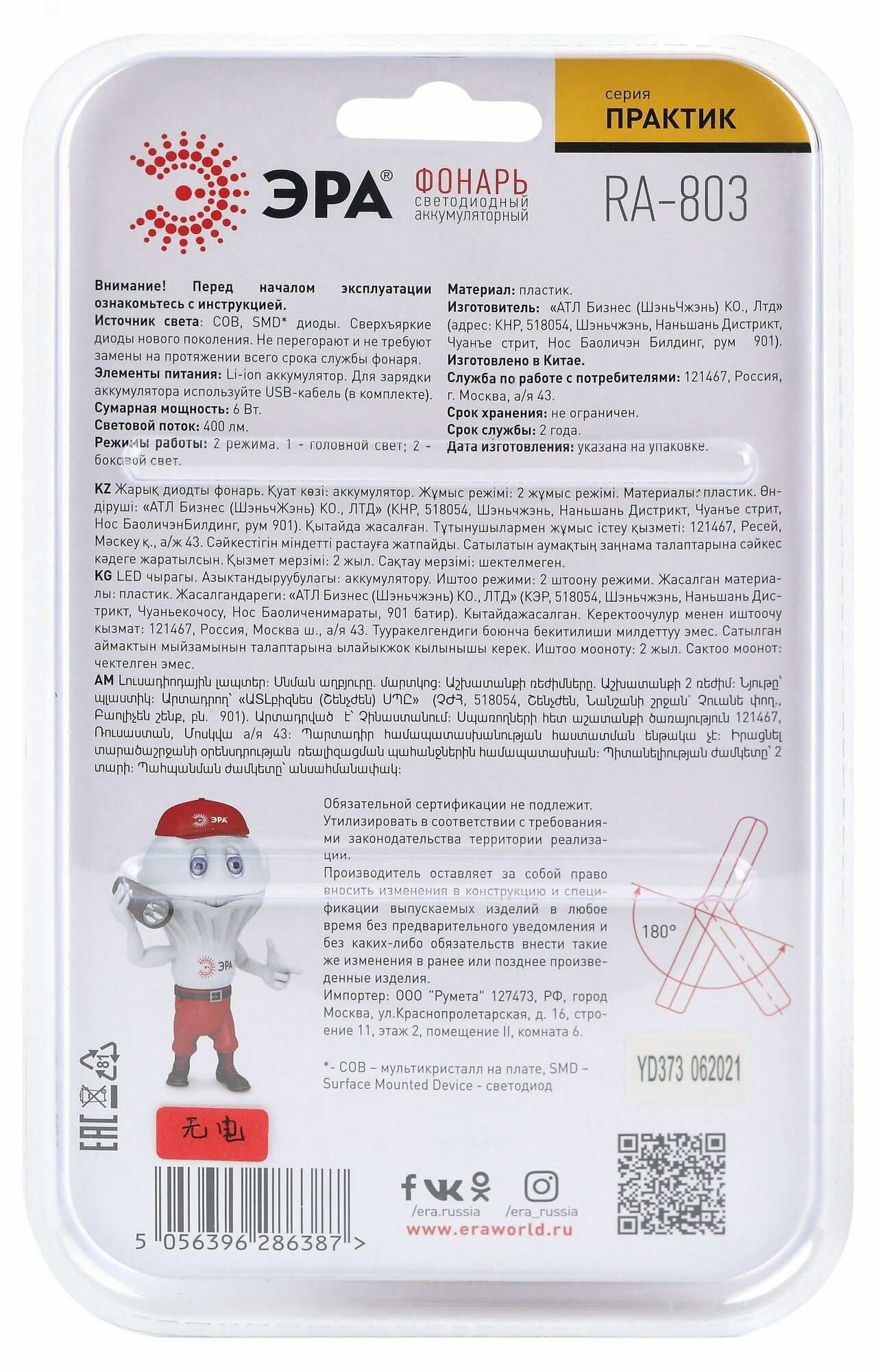 Эра Б0052313 Светодиодный фонарь Рабочие, серия "Практик" RA-803 аккумуляторный, крючок, магнит, miscro USB
