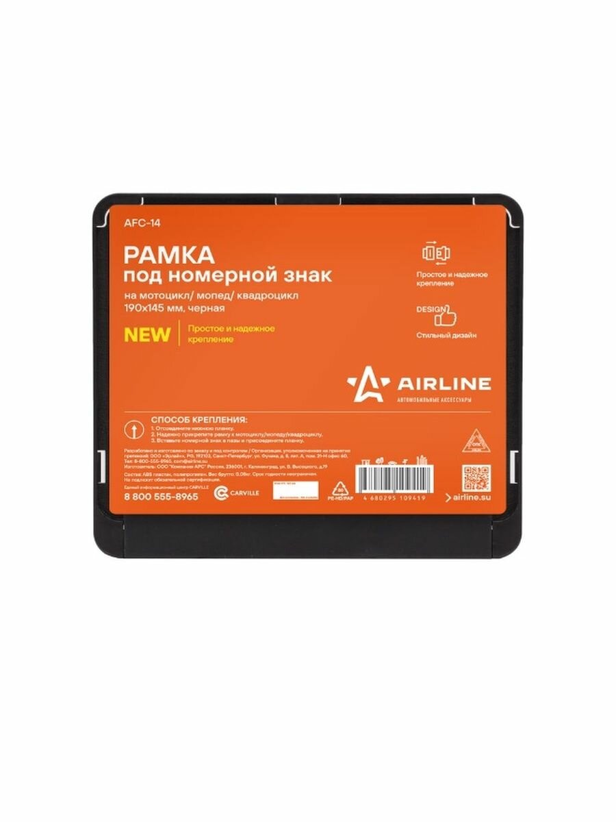Купить AIRLINE Рамка под номерной знак на мотоцикл/мопед/квадроцикл, 190*145 мм, черная, AFC-14, ГОСТ Р 50577-2018